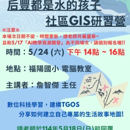 為強化教師數位應用能力與課程發展深度,后豐社區大學辦理教師社群培力課程,以「葫蘆墩圳文史社區GIS數位學習」為主題,邀請詹智傑主任主講「社區GIS數位資料庫建構(一)」,引導教師逐步建立社區GIS資料建置與應用之基礎能力。