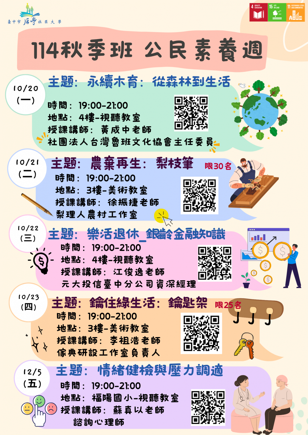 本期后豐社大公民素養週以「永續‧共好」為核心,呼應SDGs精神,課程內容兼顧環境、金融與心理三大面向。透過木育教育,認識國產材運用與碳足跡減量,並學習農廢木材再利用,實踐循環經濟,落實環境永續。同時規劃銀髮金融知識講座,幫助長輩了解金融風險、避免詐騙陷阱,並安心規劃退休金與生活資源,提升生活安全感。此外,也安排情緒健檢與壓力調適課程,協助學員培養心理韌性與身心平衡。從資源到心靈,從社區到地球,后豐社大邀您一同實踐永續未來。