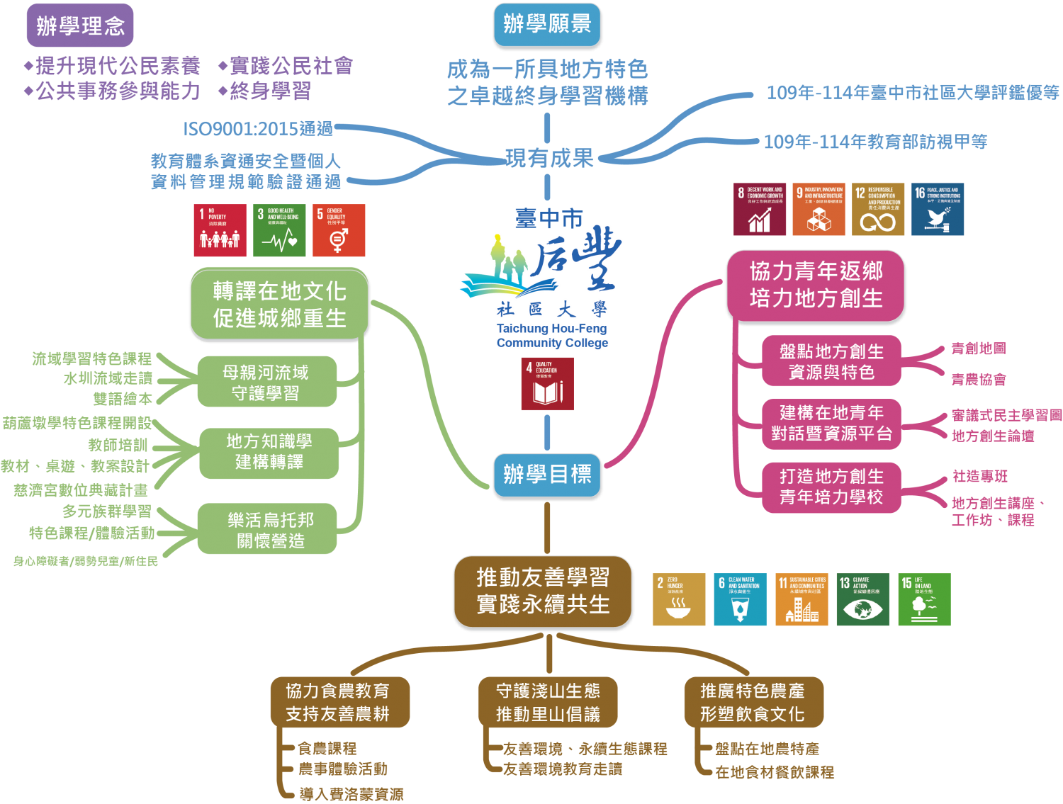 后豐社區大學為實踐公民社會與終身學習,整合在地資源促進地方合作,推動地方創生、環境永續與傳承在地文化,以成為一所『具地方特色之卓越終身學習機構』為辦學願景,擬訂三生目標(重生、共生與創生)及九大策略行動方案,循序漸進建立辦學特色與落實在地經營。