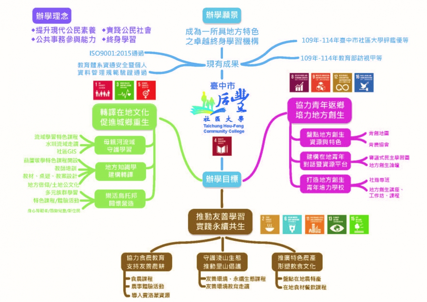 后豐社區大學為實踐公民社會與終身學習,整合在地資源促進地方合作,推動地方創生、環境永續與傳承在地文化,以成為一所『具地方特色之卓越終身學習機構』為辦學願景,擬訂三生目標(重生、共生與創生)及九大策略行動方案,循序漸進建立辦學特色與落實在地經營。